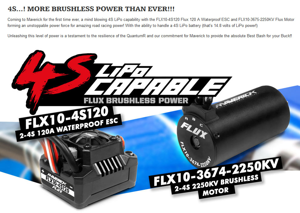 Coming to Maverick for the first time ever, a mind blowing 4S LiPo capability with the FLX10-4S120 Flux 120 A Waterproof ESC and FLX10-3675-2250KV Flux Motor forming an unstoppable power force for amazing road racing power! With the ability to handle a 4S LiPo battery (that's 14.8 volts of LiPo power!)